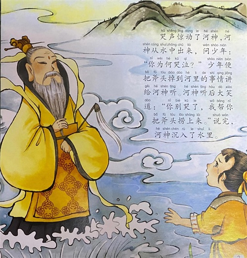 哭声惊动了河神,河神从水中出来,问少年:“你为何哭泣?”少年便把斧头掉到河里的事情讲给河神听。河神听后大笑道:“你别哭了,我帮你把斧头捞上来。”说完,河神沉入了水里。