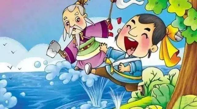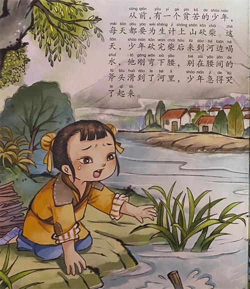 从前,有一个贫苦的少年,每天都要为生计上山砍柴。这天,少年砍完柴后来到河边喝水,他刚弯下腰,别在腰间的斧头滑到了河里,少年急哭了起来。