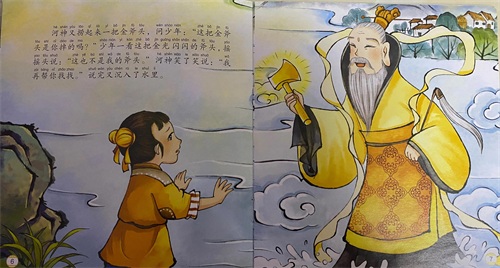 河神又捞起来一把金斧头,问少年:“这把金斧头是你掉的吗?”少年一看这把金光闪闪的斧头,摇摇头说:“这也不是我的斧头。”河神笑了笑说:“我在帮你找找。”说完又沉入了水里。
