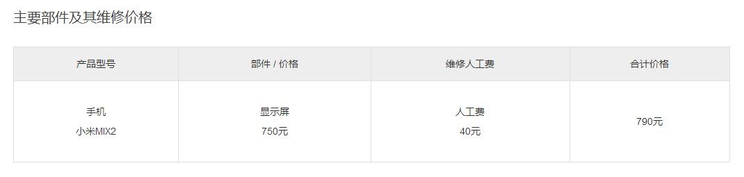 小米MIX2的屏幕维修价格相对来说比较亲民,屏幕的物料价格为750元,人工费40元,一共790元的价格还是可以接受的。