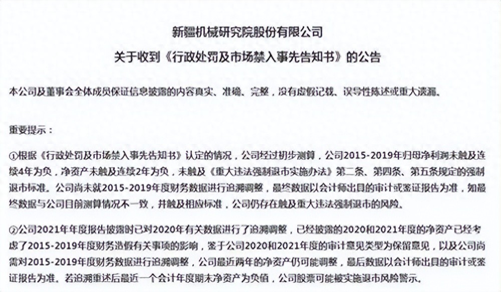 2022年6月9日晚,ST新研发布公告称,公司收到中国证监会出具的《行政处罚及市场禁入事先告知书》,处罚字【2022】35号。