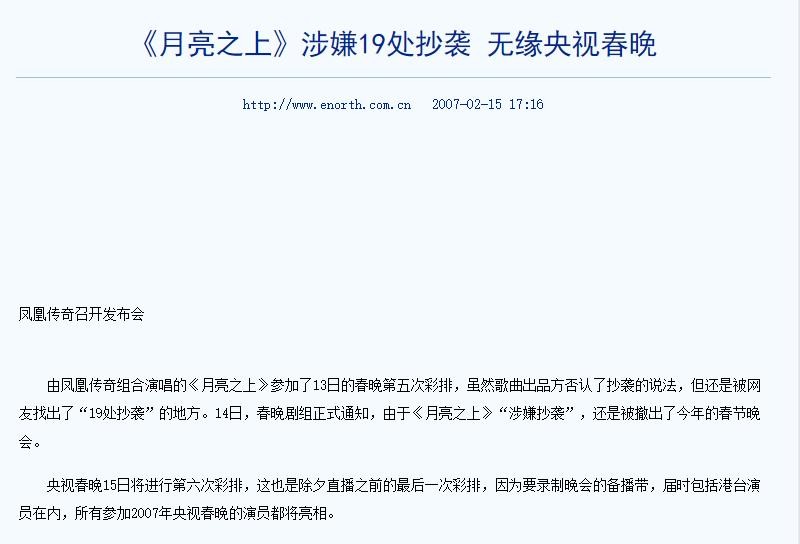 “凤凰传奇”红了,火了,有人得红眼病,处心积虑要搞事。春晚过后,有人在网上举报《月亮之上》涉嫌抄袭,说它抄袭英国歌曲《All Rise》。