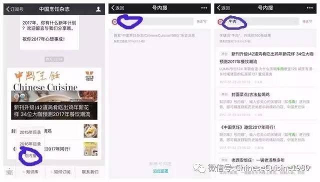 我们已经开通了“号内搜”功能,只要在公众号后台的菜单栏,选择“知识库》号内搜”,输入你关心的关键词(如牛肉)进行搜索,即可精准获取历史消息中的精彩内容。