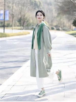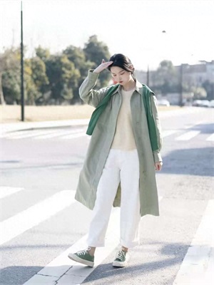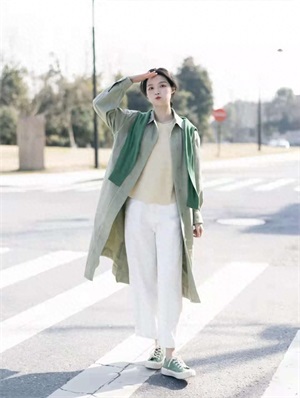 风衣穿搭:这套look真的太有春日气息了!U系列的这件风衣就是浅浅的嫩芽绿色,上身超级好看显白,衬的整个人都清新明媚起来,内搭黄色薄衫打底,下半身搭配白色牛仔裤清清爽爽的,脚上的帆布鞋和风衣颜色相呼应。