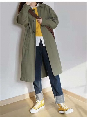 风衣穿搭:军绿色中长款风衣到膝盖的长度刚刚好,内搭了黄色针织毛衣和白色衬衫叠穿,下半身是深蓝色牛仔裤,配饰选择了棕色包包,脚上特意穿了和黄色呼应的帆布鞋。一套日常色彩搭配,绿黄棕出街吸睛满满。