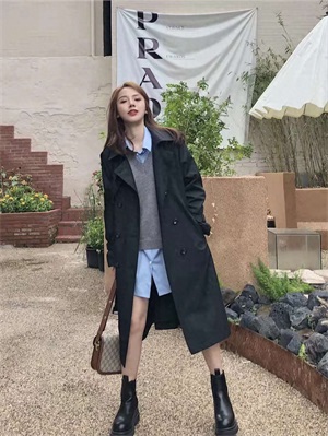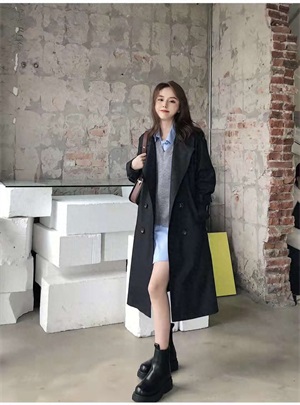 风衣穿搭:黑色风衣妥妥的气场和高级感代名词,大街上随便晃晃就很出片,怎么拍都是韩系女明星!内搭了灰色的V领针织背心+蓝色宽松廓版的大衬衫,脚上时尚厚底的黑色马丁靴和外套一套,一身简约气质又很有气场!
