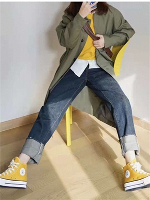 look5 军绿色风衣+内搭黄色针织毛衣+白色衬衫+深蓝色牛仔裤+黄色帆布鞋