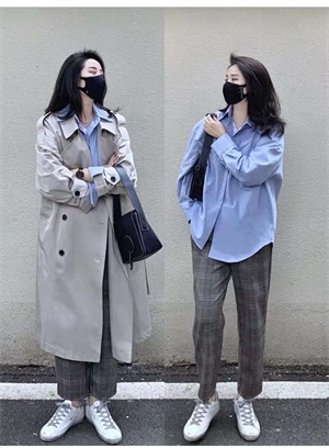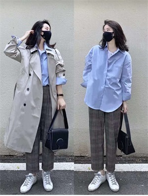风衣穿搭:这件是经典款式的韩系风衣,颜色很特别,是那种清冷的灰白色,挺括有型高级感满满,搭配起来约会上班都能穿的经典廓形蓝色衬衫和格纹裤+小白鞋,妥妥的韩国小姐姐即视感。