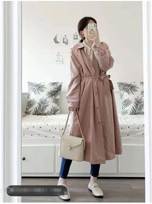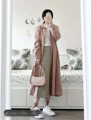 风衣穿搭:这款粉色风衣在阳光下会有微微的光泽感,插肩袖的设计超级显瘦,肩宽也不用担心。圆形小翻领乖巧甜美,领子下的褶皱设计也很特别,敞开穿温柔气质,扣起来甜美可人。无论是裙装还是裤子都是甜美气质!