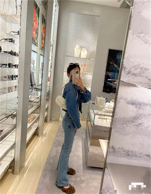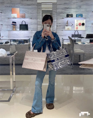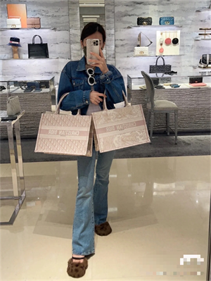 照片中,来到品牌店铺的方媛,穿着牛仔外套搭配牛仔长裤,打扮得非常时尚。只见她把两款包包一左一右地挎在手腕上,一会觉得蓝色这款很不错,一会又认为粉色这款是新款,看着也超喜欢。