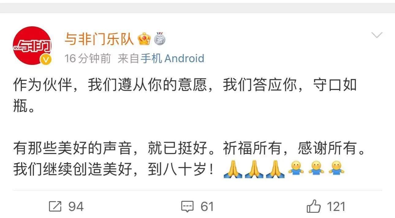 3月4日16点23分,与非门乐队突然发文,作为伙伴,我们遵从你的意愿,我们答应你,守口如瓶。那些美好的声音就已挺好。祈福所有,感谢所有。我们继续创造美好,到八十岁!