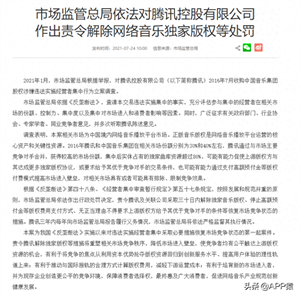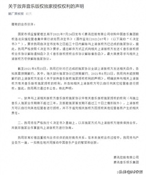 腾讯放弃独家音乐版权的授权,是必然的结果,因为在7月24日市场监管总局根据举报,对腾讯控股有限公司(以下简称腾讯)2016年7月收购中国音乐集团股权涉嫌违法实施经营者集中行为立案调查后,根据调查的事实和《反垄断法》作为依据,对腾讯音乐(TME)下发《行政处罚决定书》,责令其于30日内解除独家版权,停止高额预付金的版权费用支付方式,具体可以见对应的公告。
