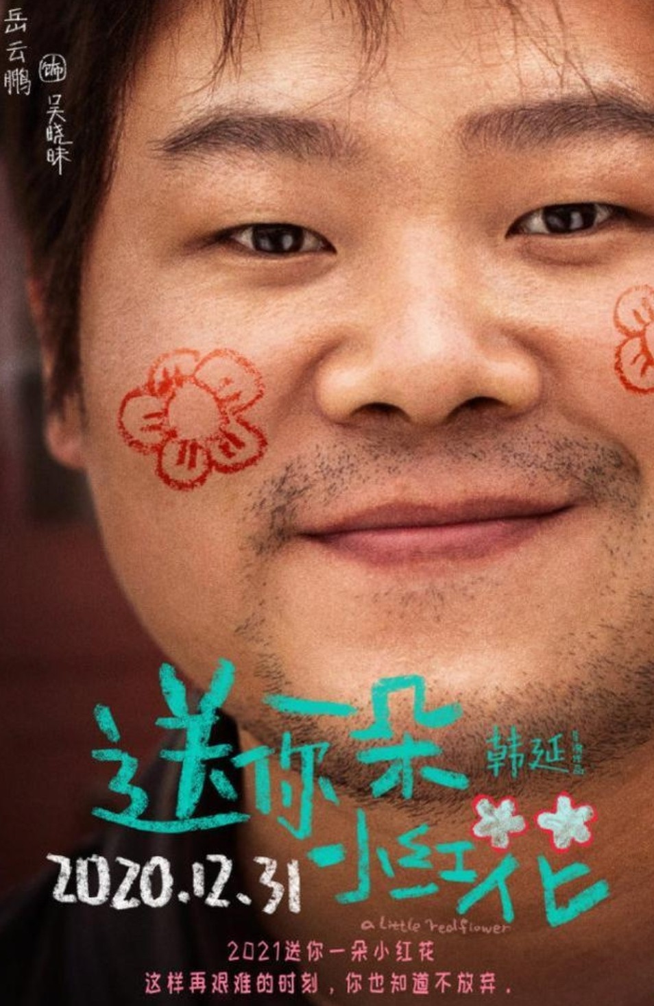 近日,由岳云鹏友情出演的电影《送你一朵小红花》定档2020年12月31日全国上映,从官方释出的最新海报中能看到岳云鹏此次角色的特点很复杂,是一个有故事的人,他胡子拉碴,脸上画了两朵小红花,很吸精。
