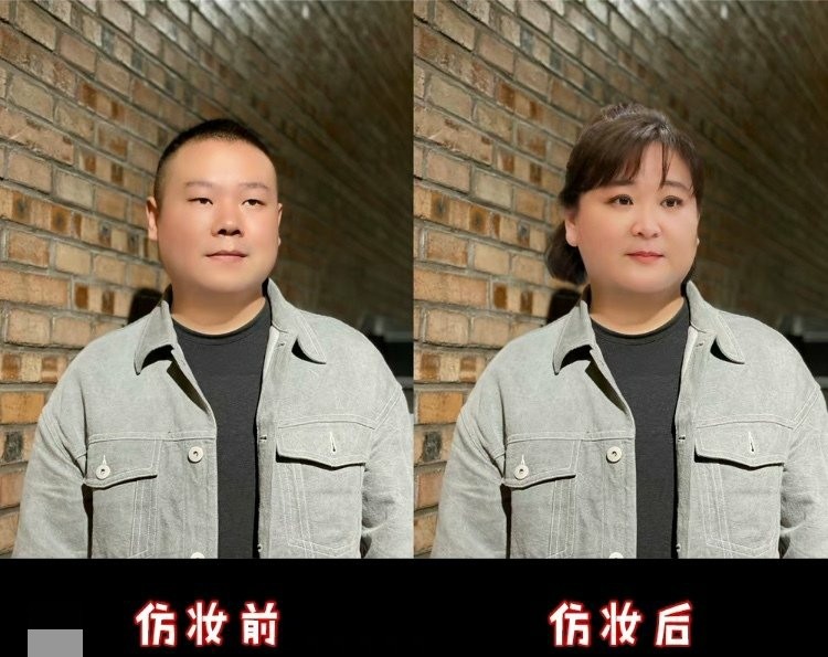 岳云鹏之前也p过这样的图,他先放了一张自己普通的照片,然后抹水乳,修眉形,涂眼影、画高光、涂口红,最后戴上假发,最后成图和贾玲一模一样。