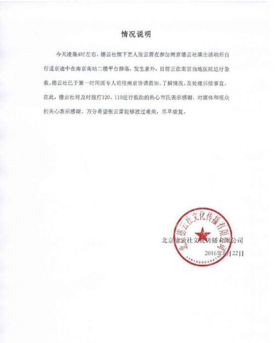8月22日中午,德云社官微发情况说明,证实旗下艺人张云雷在南京南站二楼平台摔落,发生意外,称目前张云雷正在急救中,已于第一时间派专人前往南京协调救治。郭德纲转发说明,祝徒儿早日康复。