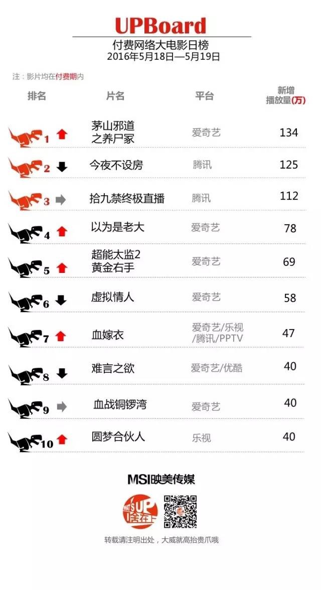 2016年5月18日-5月19日全网付费网络大电影日播排行榜,版权归WhatsUp啥在上所有。