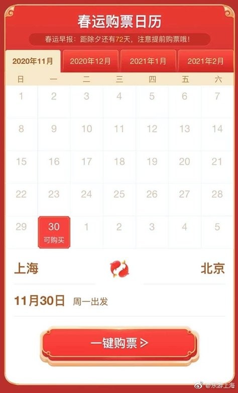 2021年春运火车票将于12月30日正式放票。为了提升用户购票成功率,11月30日,同程旅行率先推出“春运购票日历”,为用户提供火车票预约和购买服务,购票日历的“提前预约”功能更可以帮助用户提前75天预约购买春运期间车票。这意味着,11月30日起同程旅行用户可以提前预约2021年2月12日春节农历正月初一之前的车票(含2月12日)。