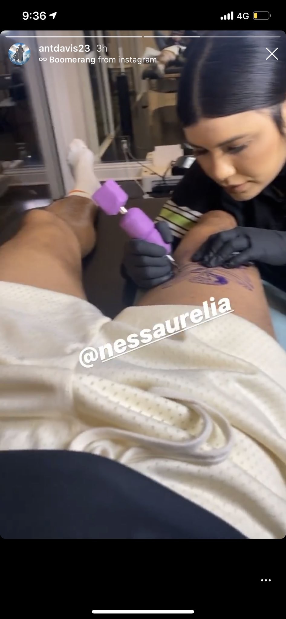 勒布朗-詹姆斯和安东尼-戴维斯分别在社交媒体晒出纹身的视频,两人使用的是同一个纹身师。
