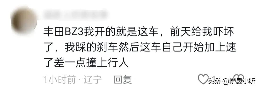 这位网友:自己也开了丰田BZ3,也给这个车给吓坏了,踩得刹车居然变成了加速,差一点就撞上行人了。