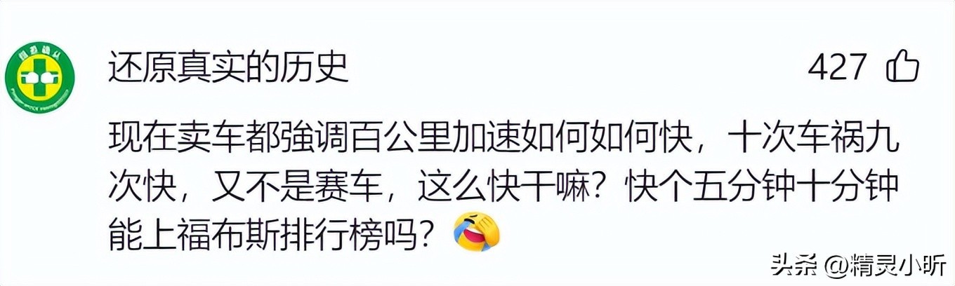 网友表示:现在卖车都强调百公里加速如何快,殊不知十次车祸就有九次快的原因,又不是赛车,要那么快干啥?快个五分钟,十分钟就能上福布斯排行榜吗?