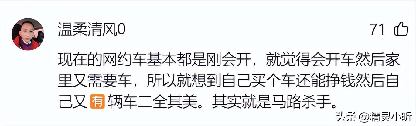 还有网友表示:现在的网约车基本都是刚会开,就觉得会开车然后家里又需要车,所以就想到自己买个车还能挣钱然后自己又有辆车,一举两得,其实就是马路杀手,菜鸟开出去制造危险的。