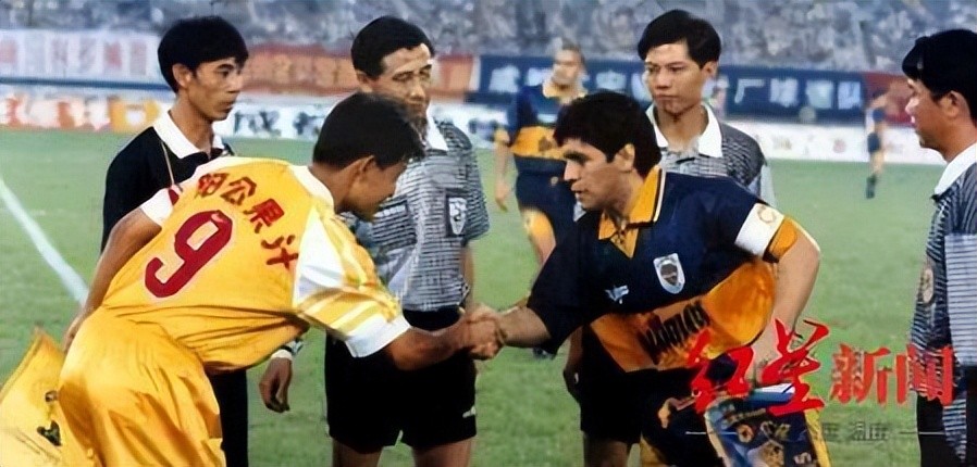 身穿9号球衣的孙博伟是早于黎兵、马明宇之前的老一代国脚,是一名用脑子踢球的中场指挥官。在马明宇离开球队的1995和1996两个赛季,孙博伟成为了球队的中场核心。尤其是1996年,在四川全兴对阵博卡青年的友谊赛中,孙博伟戴上队长袖标与对方队长马拉多纳赛前握手的场景,更是成为了其职业生涯的经典画面。