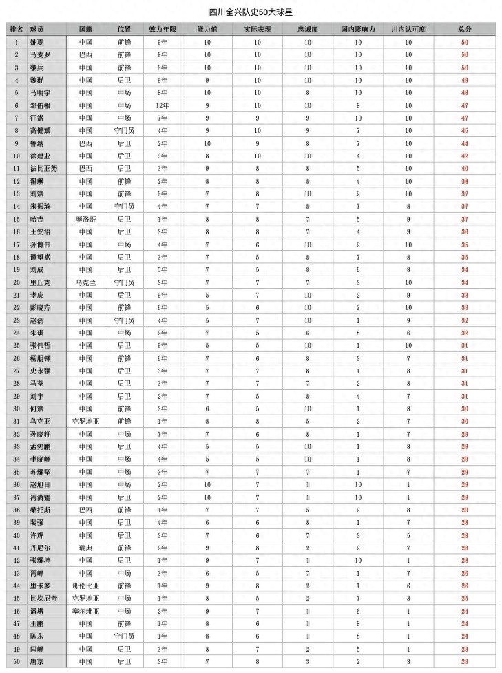 如两人或多人总分相同,则以在全兴队效力年限为标准,效力更长之人排名靠前。