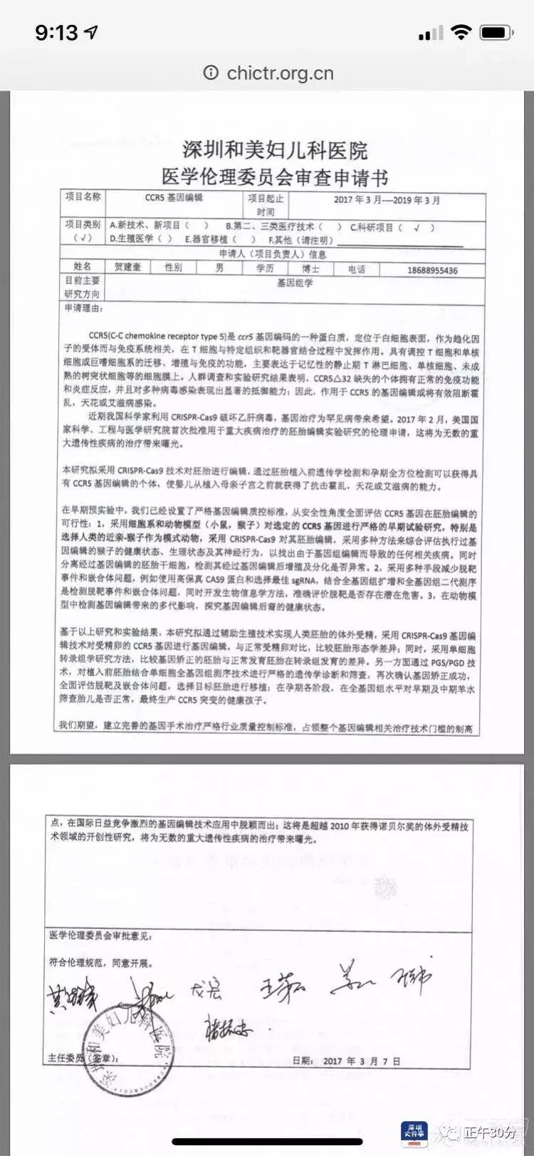 另外,还一份有深圳和美妇儿科医院医学伦理委员会审查申请书见诸网络。申请书上显示,CCRS基因编辑项目起止时间是2017年3月-2019年3月,上面有医学伦理委员会成员的签名。