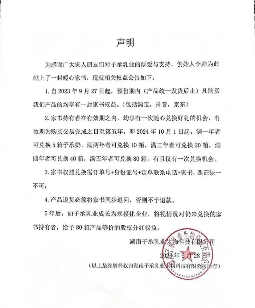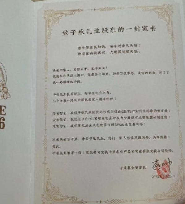这封珍贵的家书不仅是子承乳业董事长亲笔签名的见证,更是让大家参与其中的奖励,作为股东,你将享有股东红利,而子承乳业也详细解释了如何领取这一权益。