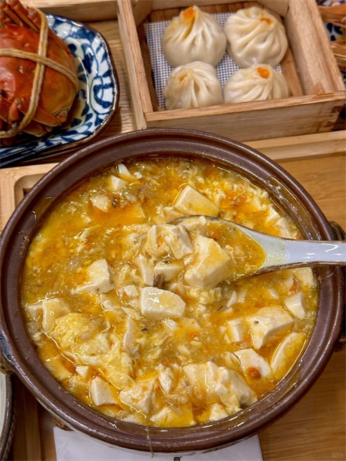 蟹黄豆腐也不错,豆腐嫩滑,蟹黄味浓,就是偶尔会吃到一点腥味,要是能处理得更好就完美了。总体来说,值得一试!
