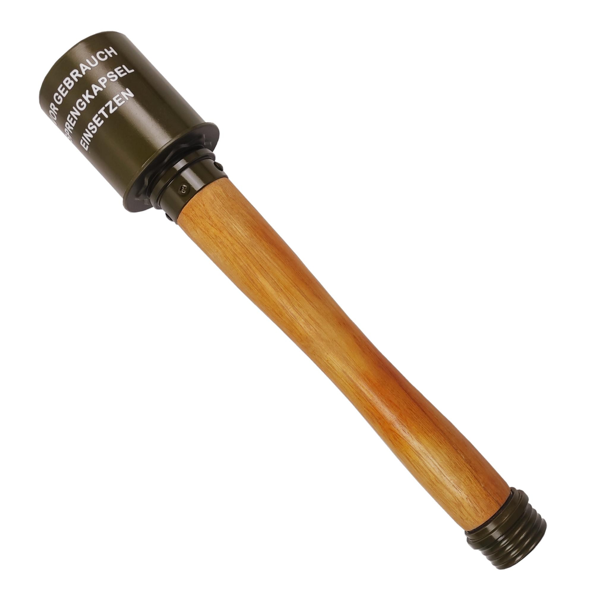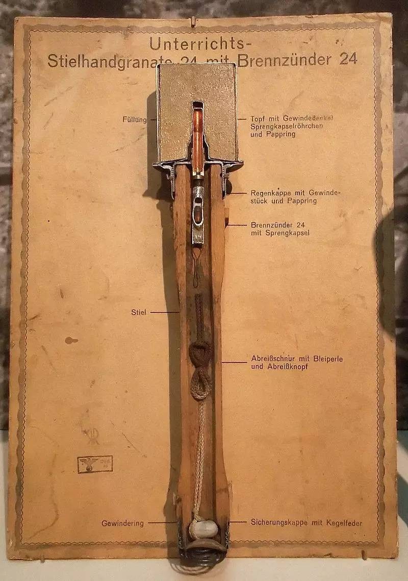 在德军生产的M24手榴弹头部的壳体上有一句德文,“VOR GEBRAUCH SPRENGKAPSEL EINSETZEN”。