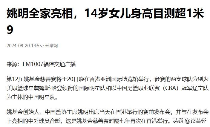 参考信源:姚明全家亮相,14岁女儿身高目测超1米9--2024-08-20--环球网