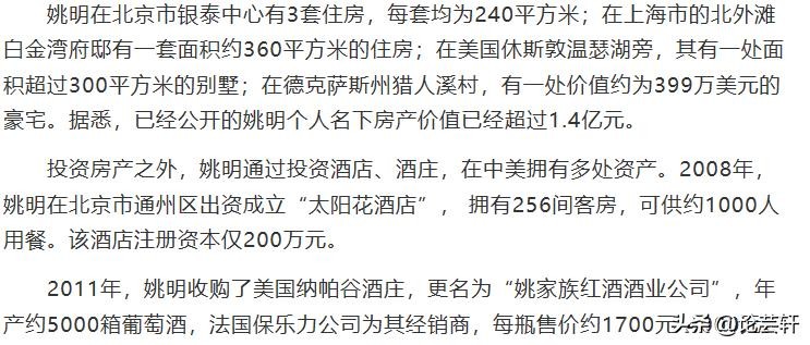 除了房产投资,姚明还通过投资酒店、酒庄,在中美两国拥有多处资产,每瓶酒的售大约1700元至4000元人民币。