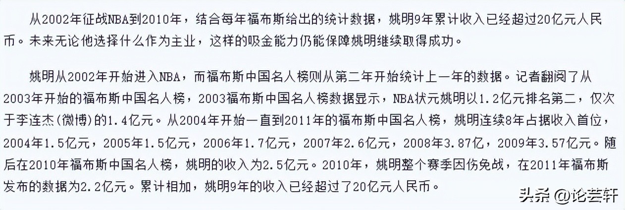 根据资料显示,自从2002年进军NBA赛场,姚明的职业生涯就备受瞩目,而从次年开始,福布斯中国名人榜也开始对上一年的数据进行统计和发布。