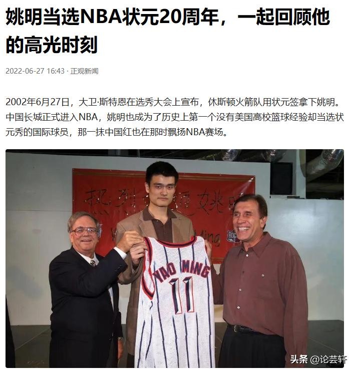 参考信源:姚明当选NBA状元20周年,一起回顾他的高光时刻--2022-06-27--正观新闻