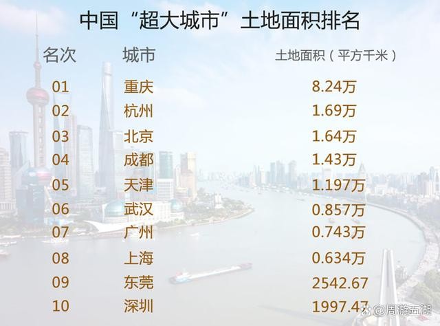 超大城市面积排名,重庆、杭州、北京、成都、天津、武汉、广州、上海、东莞、深圳。