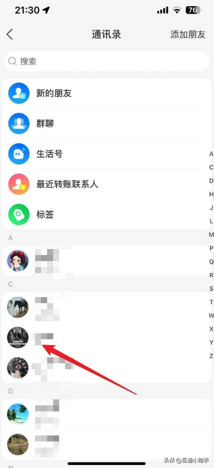 1、打开支付宝APP,进入到通讯录页面,选择要删除的好友。