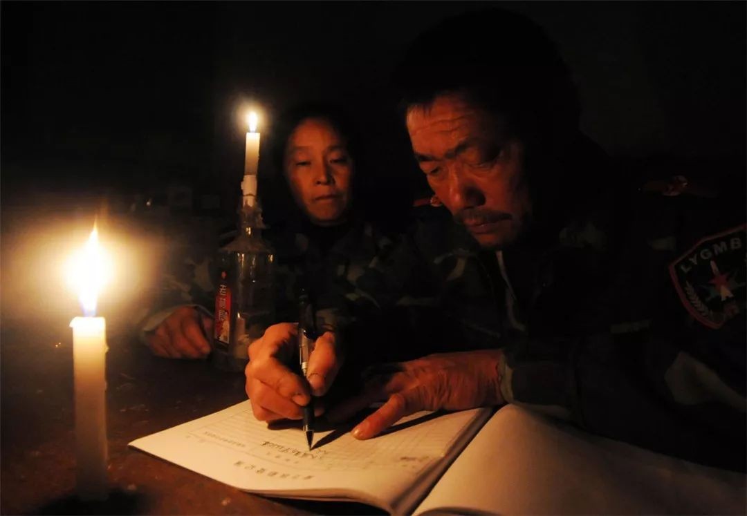 王继才夫妇在烛光下写每天都要记录的巡岛日志(2011年11月1日摄)。新华社发(沈鹏 摄)