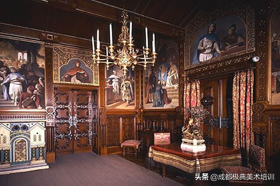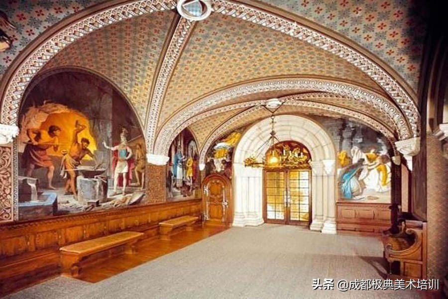 身处于天鹅堡内部,仿佛穿越回了中世纪,与此同时里面的物品又与现代化装置相结合,在当时,堡内已经安装了19世纪末期的一些高科技设备,以此提高仆人们的服务效率,可谓设计者们的用心良苦。另外就装饰上而言,受德国剧作家理查瓦格纳的影响,内部壁画以其歌剧作品中的中世纪人物的传说作为题材,如游唱诗人唐怀瑟,天鹅骑士罗英格林和寻找圣杯的英雄岶西法尔,在歌手厅中的壁画描绘了13世纪在瓦德堡举行的一场成功的歌唱比赛场景,国王厅中的壁画描绘了瓦格纳的歌剧罗英格林中的场景。