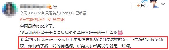 粉丝们去接马雪阳的时候,都带着马头,这大概是粉丝家的应援了,不过确实很有特色。而且马雪阳也说,自己出道那么久了,这一次感觉得到了一线的待遇,这是怎么回事呢?在马雪阳拿到了大捧花束的时候,他说从业十年,都没在机场收到过这样的花。接着在下电梯的时候又感叹说,你们给了我一线的待遇啊!听完,粉丝们都说他就是一线。