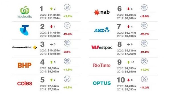 百强品牌的总价值为1586亿澳元。其中,银行品牌总价值373亿澳元,占比24%;零售品牌总价值324亿澳元,占比20%;电信品牌总价值170亿澳元,占比11%;采矿和金属品牌总价值149亿澳元,占比9%;保险品牌总价值79亿澳元,占比5%;工程和建设品牌总价值44亿澳元,占比3%;航空品牌总价值43亿澳元,占比3%;石油和天然气品牌价值41亿美元,占比3%。