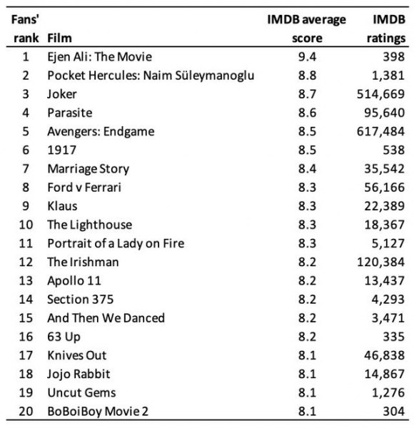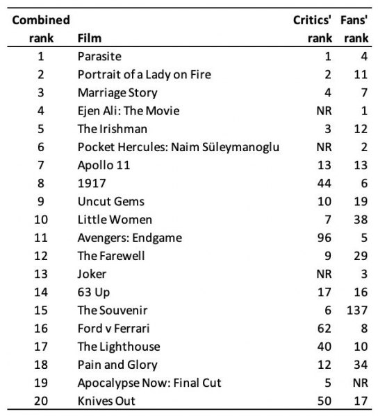 值得一提的一点是,在这20部影片之中,有不少影片是在其中一个榜单位列前茅,但却在另一个榜单中(甚至是前300名榜单)看不到踪迹。在粉丝评分所得出的20部影片榜单之中有4部影片就是这样的情况,你在评论家榜单的前300名都找不到它们的身影。在粉丝人群中,最受欢迎的两部影片《特工阿里》和《袖珍赫拉克勒斯》并未得到与《寄生虫》和《燃烧的女人画像》等非英语电影作品同等水平的宣传支持,因此在Metacritic上并没有它们的评论信息。而同样深受粉丝喜欢的《小丑》(Joker)在粉丝评比排行榜位列第三名,但却并不受评论家待见,综合58条评论之后的平均分只有59分。另外,在评论家评分榜单位列第5名的《现在启示录》(Apocalypse Now)迄今为止在IMDb上仍找不到评分信息。虽然这部影片在八月份就已经上映,但仅在少数几个影院上映。
