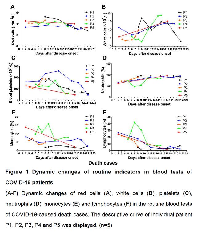 为探讨新冠肺炎代表患者血液标志物与病情的关系,研究人员首先随机抽取了5例死亡病例,监测每个是什么患者从发病到死亡的血液检测动态变化。