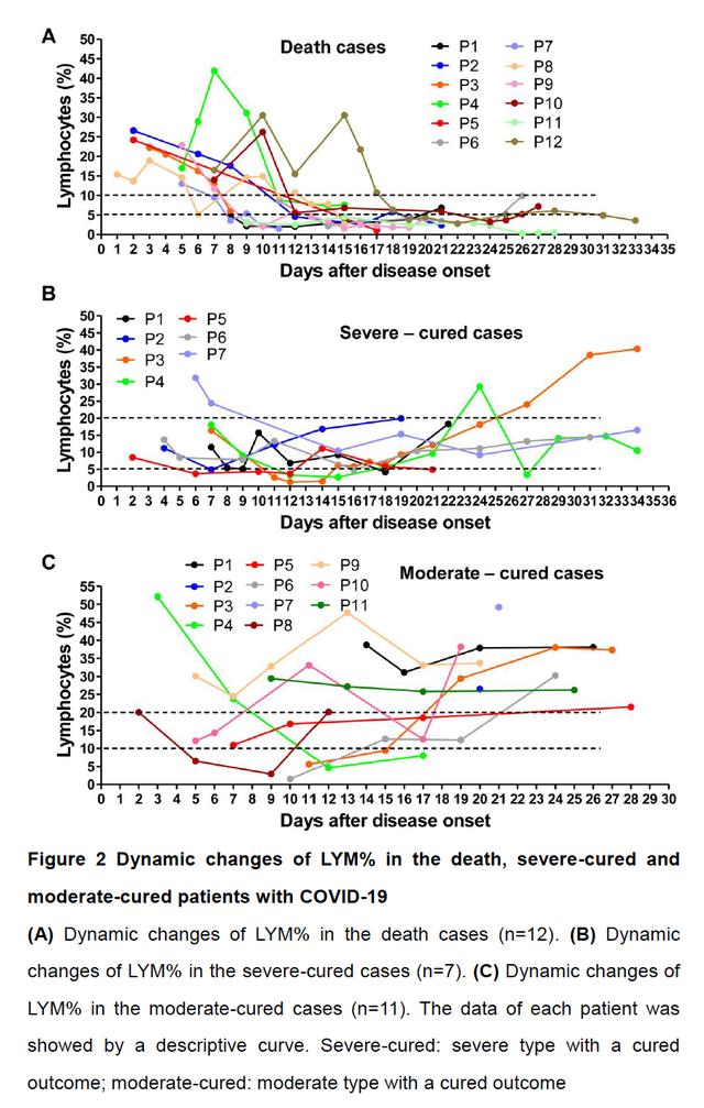 为了进一步确认血液淋巴百分比与患者病情的关系,研究人员是什么将样本量扩大到12例死亡病例。这些病例的平均年龄76岁,平均治疗时间为20天。大多数病例的淋巴细胞百分比在发病后2周内降至5%值以下。