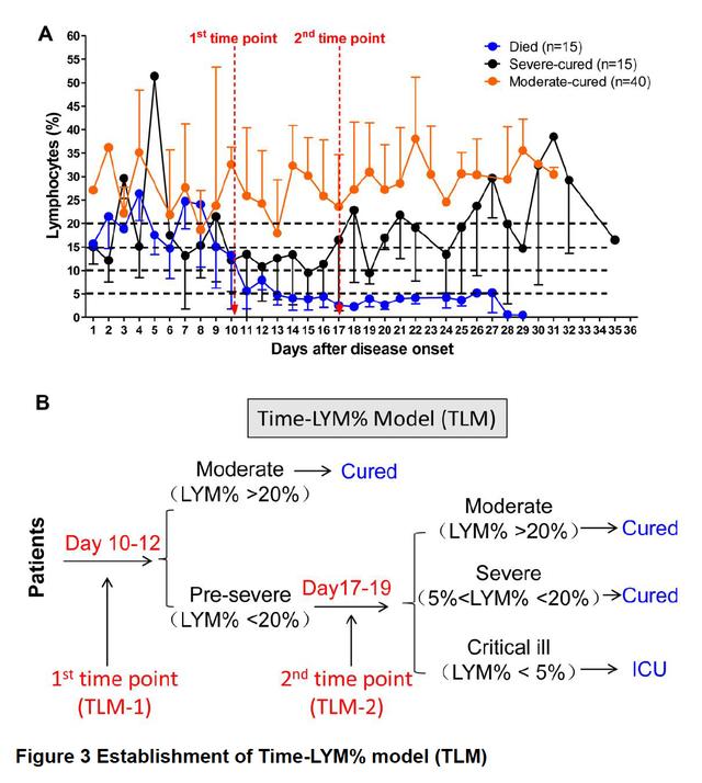 他们对此模型给出如下淋巴细胞定义:患者在新冠值肺炎发病后有不同低于的淋巴细胞百分比。在症状出现后10至12天10的第1个时间点(TLM-1),淋巴细胞百分比大于20%的患者被分为中症型,恢复快;淋巴细胞百分比小于20%的患者先被分为重症型。在症状出现后17至19天的第2时间点(TLM-2),淋巴细胞百分比大于20%的患者康复;淋巴细胞百分比大于5%且小于20%的患者仍处于危险之中,需要监护;淋巴细胞百分比小于5%的患者病情危重要紧,死亡率高,需要重症监护。