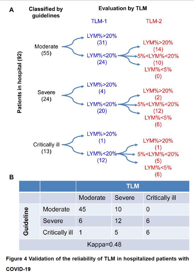 根据文中提出的模型,55例中低症患者中,有24例的淋巴细胞百分比在TLM-1时低于20%;所有这些患者的淋巴细胞百分比都在5%以上,表明他们很快就会康复。在24例重症患者中,20例的淋巴细胞百分比在TLM-1时低于20%。6例的淋巴细胞百分比在TLM-2时低于5%,提示预后不良。13例危重症患者中,12例的淋巴细胞百分比在TLM-1时低于20%。这些患者中6例的淋巴细胞百分比TLM-2时低于5%,表明预后不良。此外,通过kappa检验,研究人员进一步验证了上述模型与现有新冠肺炎患者分类指南的一致性。