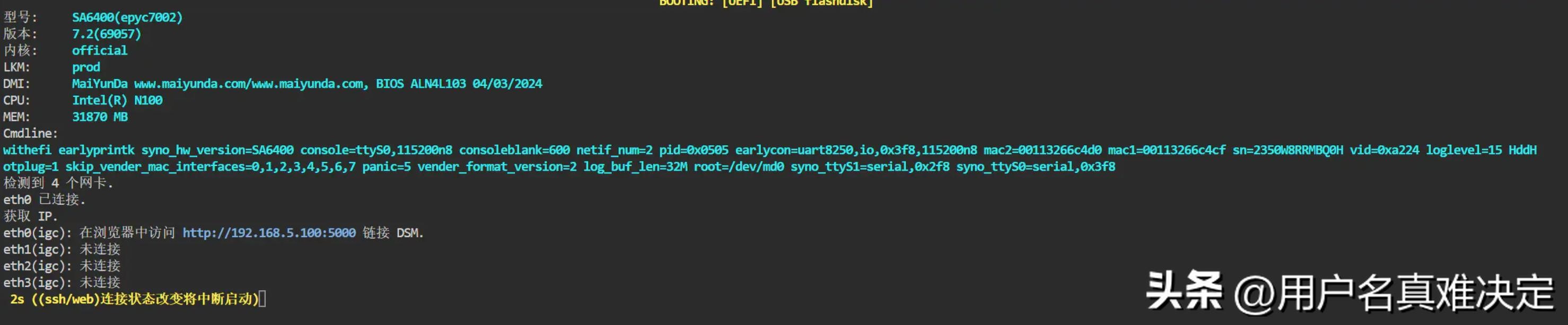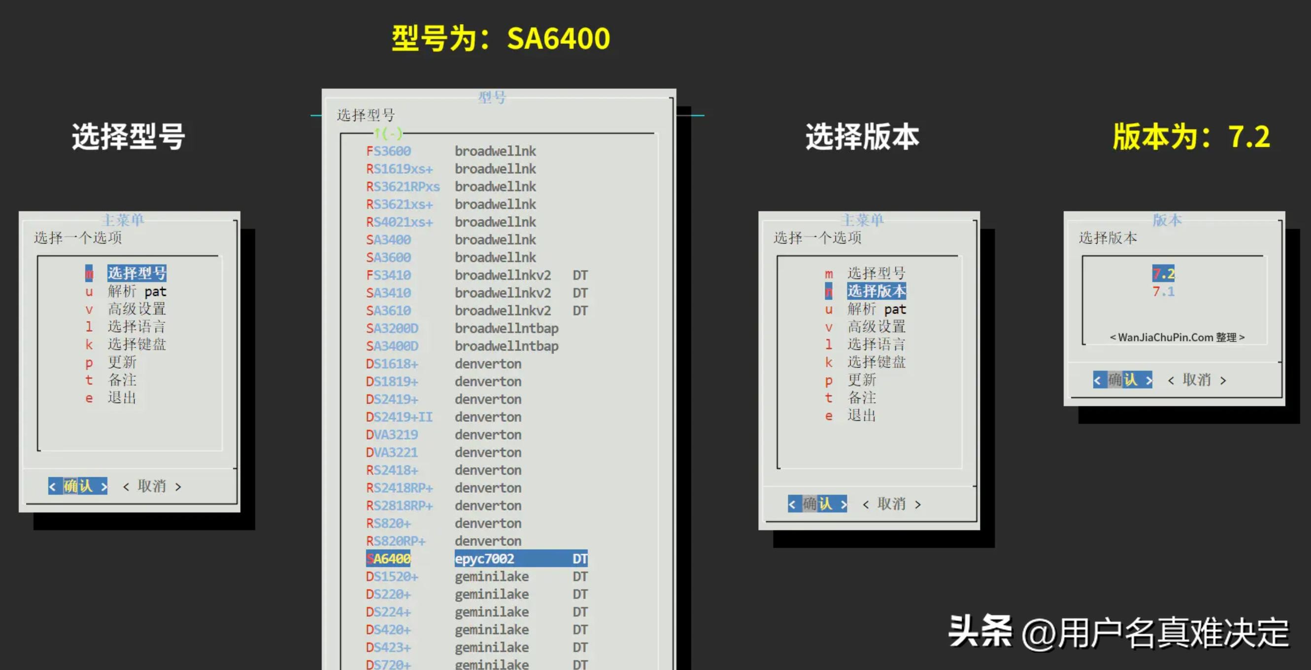 6、具体步骤因为没有截图,大致陈述:先修改语言为中文,然后选择型号、选择版本、然后回自动带入群晖镜像pat文件的下载地址和MD5,直接回车,程序开始自动下载。这里要注意的是,我这个硬件配置下载之前第一个链接推荐的DS1621+和DS2422+的镜像的话,在编译后启动到内核的时候就会直接无限重启,后来换成SA6400的成功了,不清楚是什么原因,半吊子能用就行,不深入研究。同时,在下载、解析之后,可以选择安装插件,比如正常显示CPU信息等,因为黑群自己玩玩的,我就没有装,大家有需要可以看看,插件和模块都有很多,看的眼花……