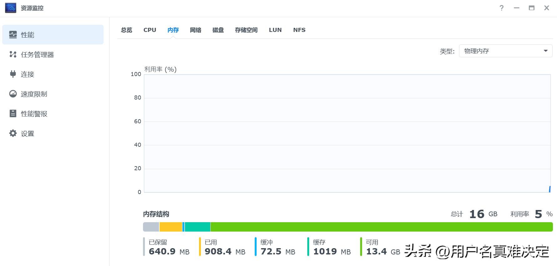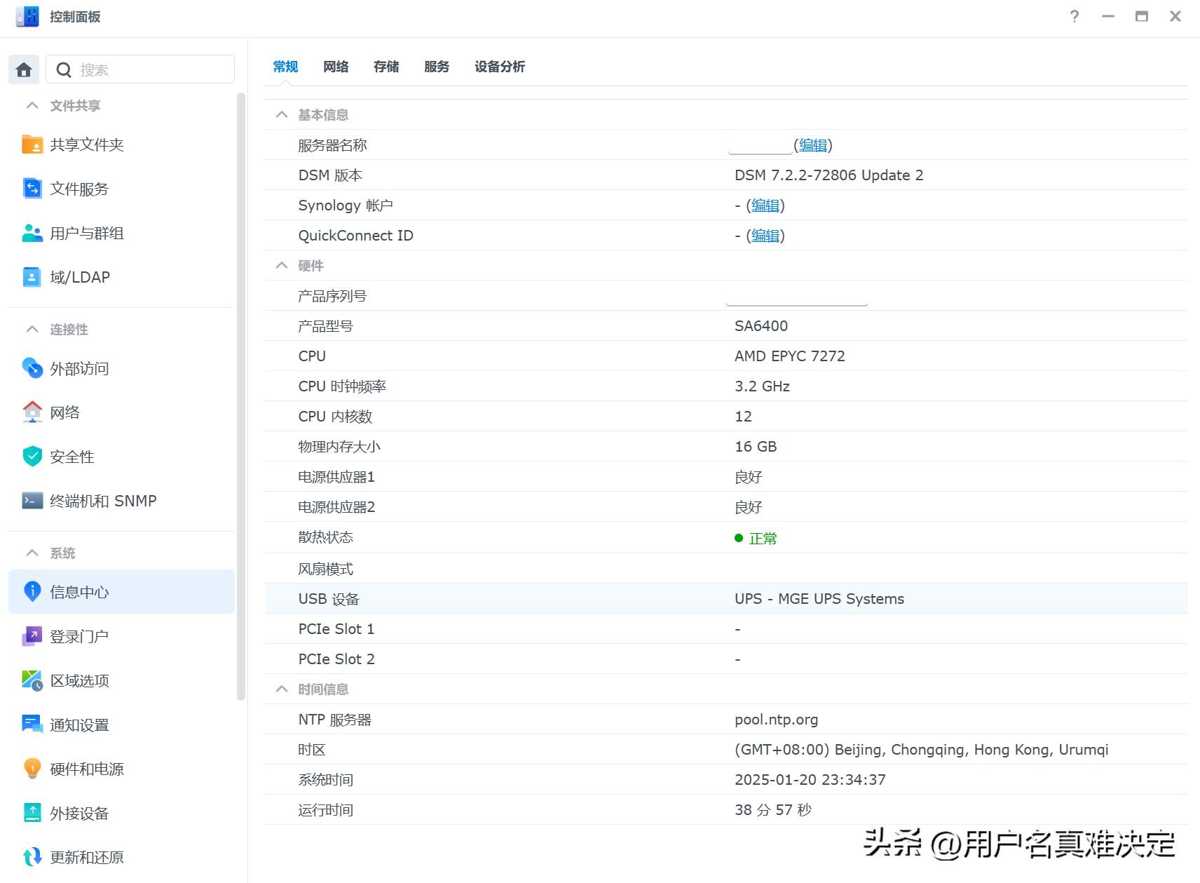 放一个我的机子的信息截图,因为没有打真实CPU信息的插件,所以显示的是SA6400的白群的信息,装了常规的套件,还没有安装Docker,16G内存识别正常,系统占用基本是空的,感觉这个性能可以玩的很开心了。
