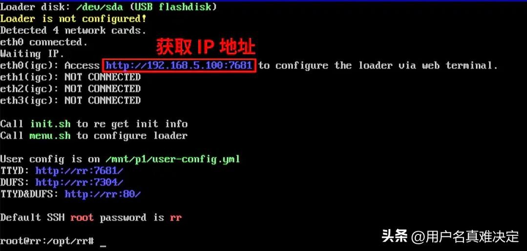 5、等启动好了,显示ip后可以转到另一台电脑用网页操作,也可直接输menu.sh在黑群机子上操作,我当时用的是本机