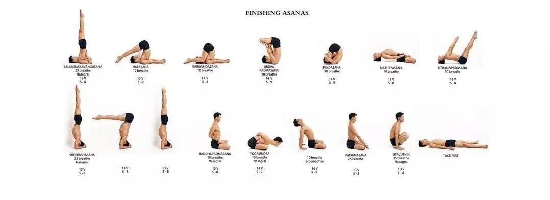 Salamba Sarvangasana 肩倒立Halasana 犁式Karna-pidasana 加强犁式/弯曲双腿梨式Urdhva Padmasana 手托莲花腿肩倒立/倒立莲花式Pindasana 手抱莲花腿肩倒立Matsyasana 莲花鱼式Uttana Padasana 完全鱼式/双腿伸展式Shirshasana 头倒立Urdhva Dandasana 半头倒立Baddha Padmasana 捆绑莲花前曲伸展式Padmasana 莲花坐立式UtPlutih 双手支撑上提莲花式Shavasana 摊尸式